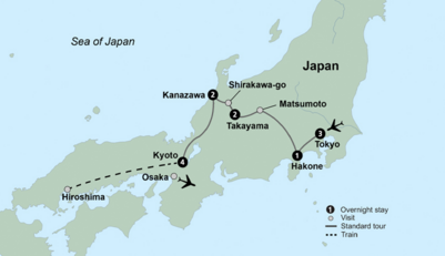 Highlights: Tokyo, Ginza, Chanting, Mediation & Private Tea Ceremony with a Monk, Hakone, Lake Ashi Cruise, Matsumoto Castle, Takayama, Shirakawa-go, Kanazawa, Kyoto, Bullet Train, Hiroshima, Maiko Show